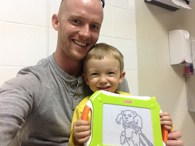 I did sleep for about four hours before waking up to bothersome minor contractions that were coming between 7-10 minutes apart. The intensity was still almost nothing compared to what I felt with Kyle; I was pretty determined they would cease before long. After timing those and Skyping my mom and pregnant sister-in-law in the middle of the night, I decided I ought to try to sleep again just in case they did progress as Thursday continued. I dozed on and off between annoying contractions and finally woke up for good that morning, tired and nervous that Ellee was really going to come before Aunt Lacy had a chance to make it here. The contractions continued sporadically throughout the morning, but they were still pathetic on the labor pain scale. We visited the hospital that morning to drop in on friends of ours who were there due to a car accident. I decided to pop into my doctor's office there at the hospital to see what he had to say. He checked and told me I wasn't dilated at all which came as no real surprise to me. I knew the contractions weren't real, intense labor pains by any means, but because I never had any "pre-labor" with Kyle, I wasn't exactly sure what was going on. My doctor sent me down to L&D to be monitored for about half an hour and see what they had to say. The nurse said the contractions weren't very strong at all and said I could go home and would likely be back.